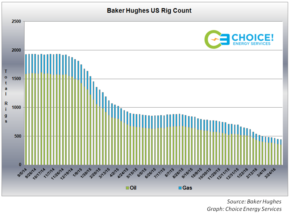 So with natural gas production continuing to rise in the face of falling rig counts, should we even care about rig counts anymore? The answer is a classic Yes and No. The shale revolution has brought technological advances to production that looking at historical rig counts will not provide any correlation to future drilling production whatsoever. BUT there still has to be a number of rigs in the ground drilling for future production wells. How many rigs are needed to maintain production has been tough to determine. Rig counts dropped dramatically in 2015, but plateaued midway through the year. Then the decline started back at the end of last year and has continued the slow and steady decline to only 443 total rigs. The latest decline could be due to continued technological advances, or it could finally be a sign that producers are cutting back in the low price environment. If production is not deterred after the latest decline, then we must wonder, how low can the rig count go?